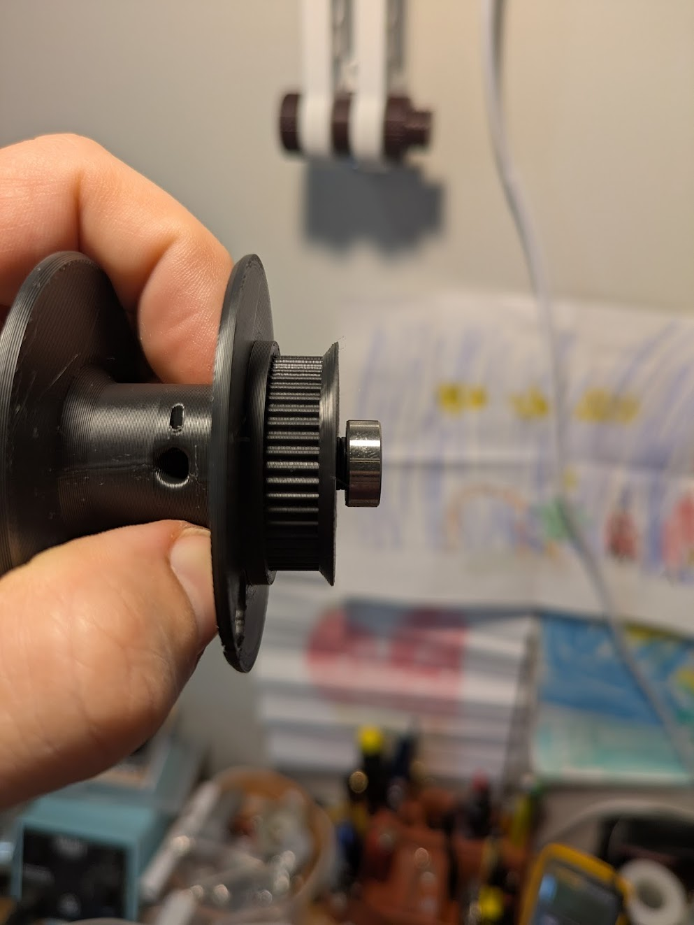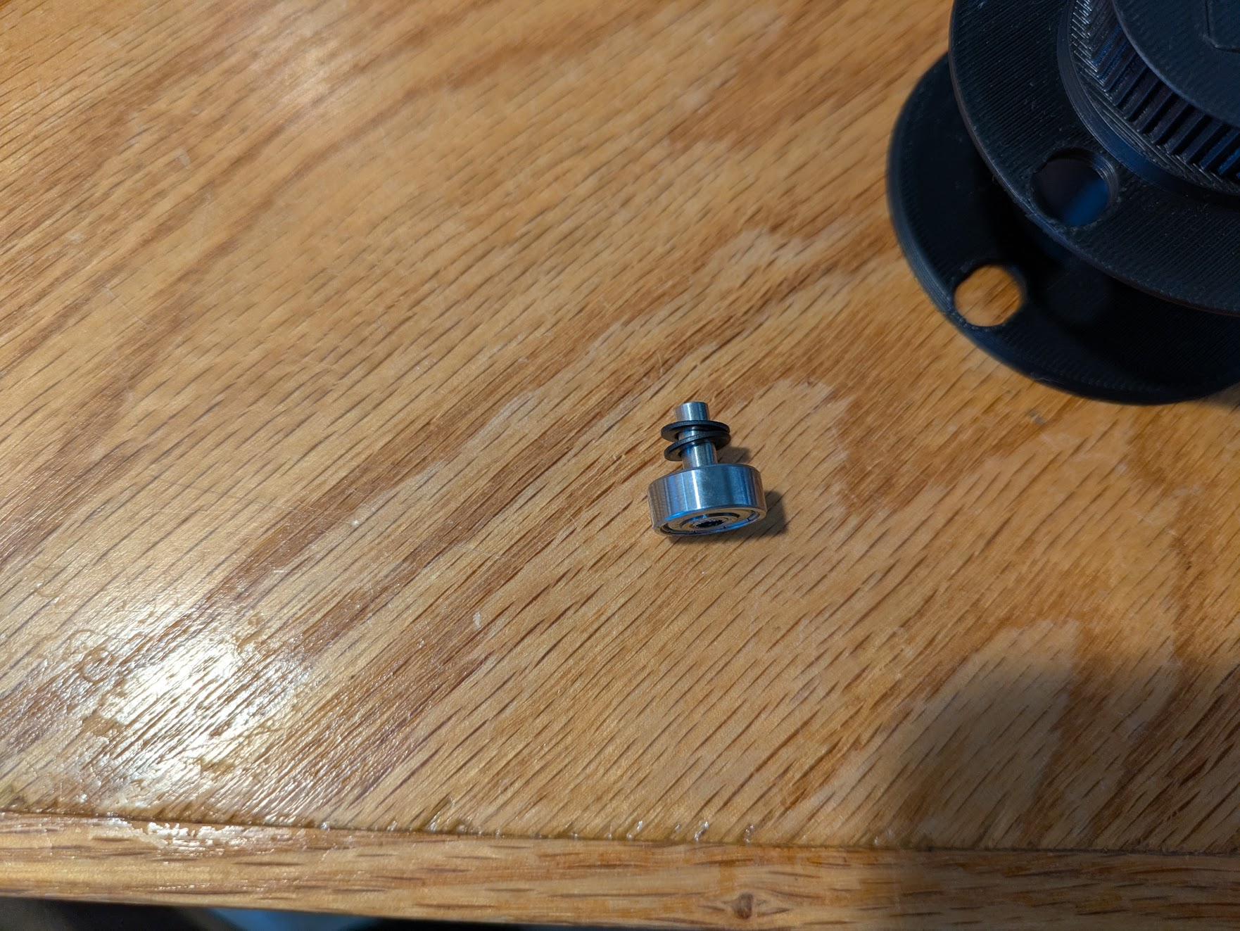 Once the glue is dry enough to handle, press a 4x14mm steel tube into one of the 4x13x5 bearings so one end is flush. Place two M4 washers onto the tube and press this into the hole on the grooved wheel side of the spool.