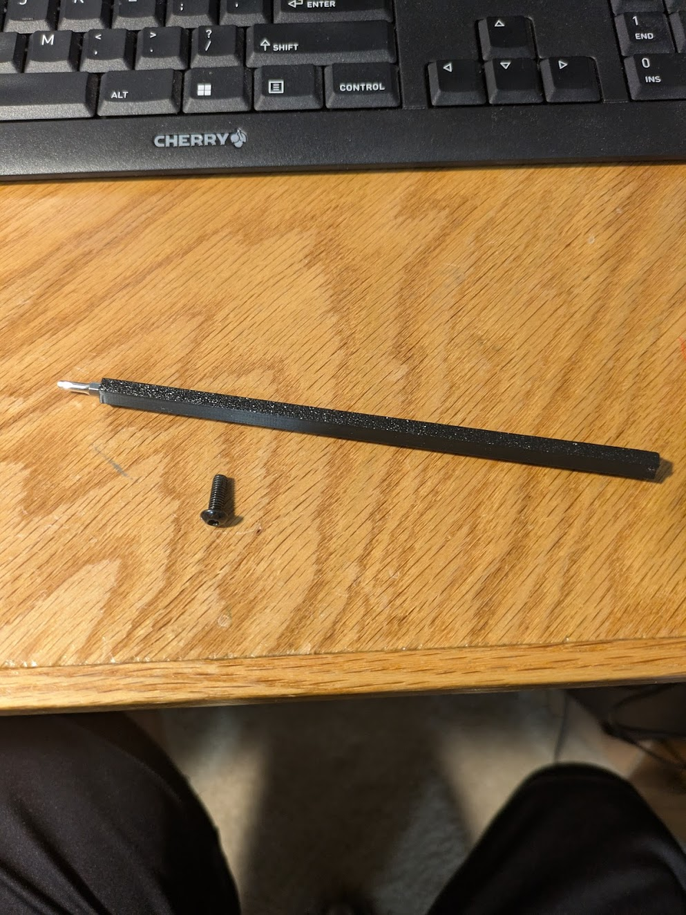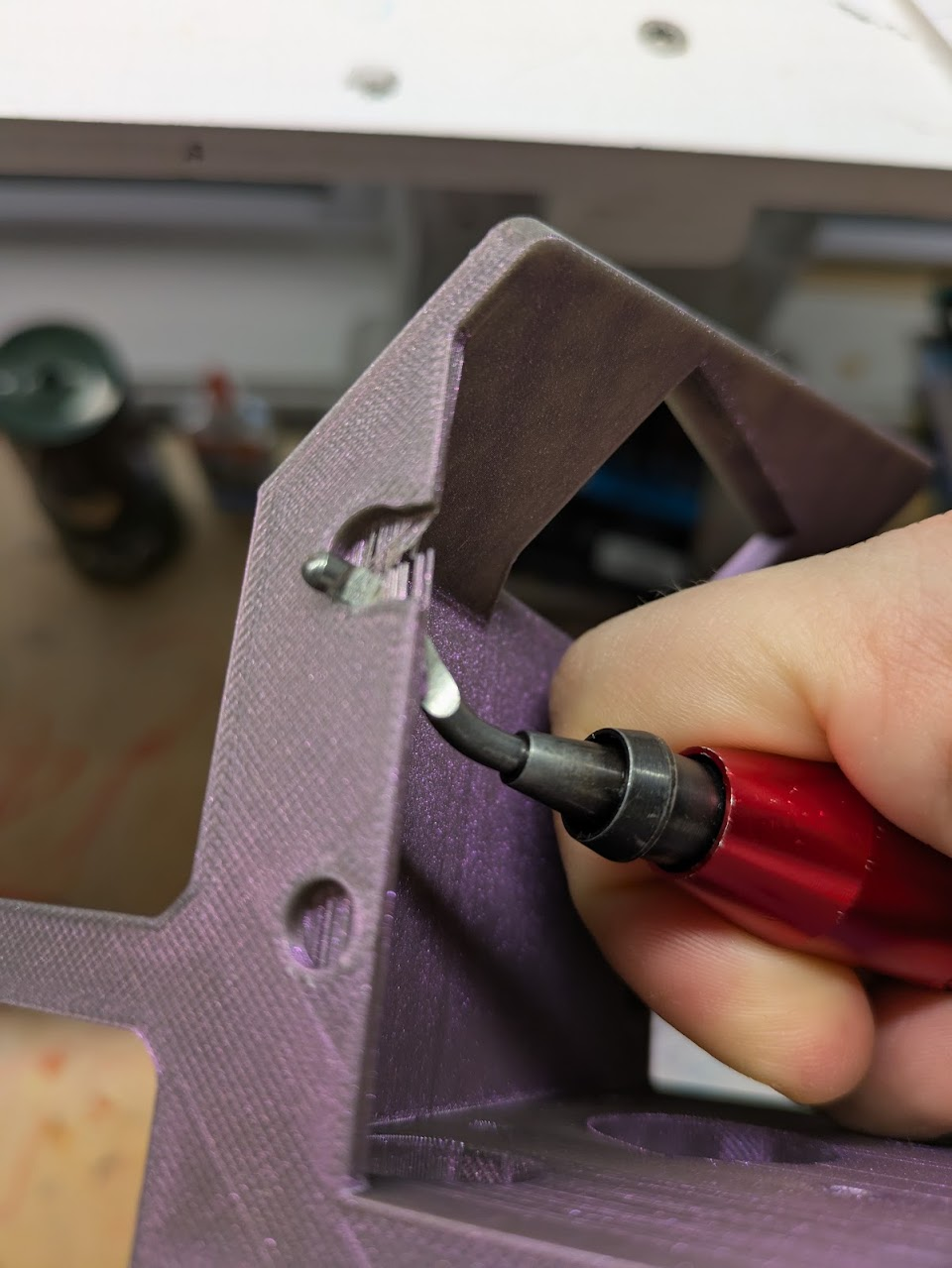 Print the long hexagonal screwdriver bit holder. You will need a brim when printing it. Most precision screwdrivers come with a set of bits with 4mm hex shanks. This is designed to fit those but be long enough to be held in a drill from the outside of this frame.