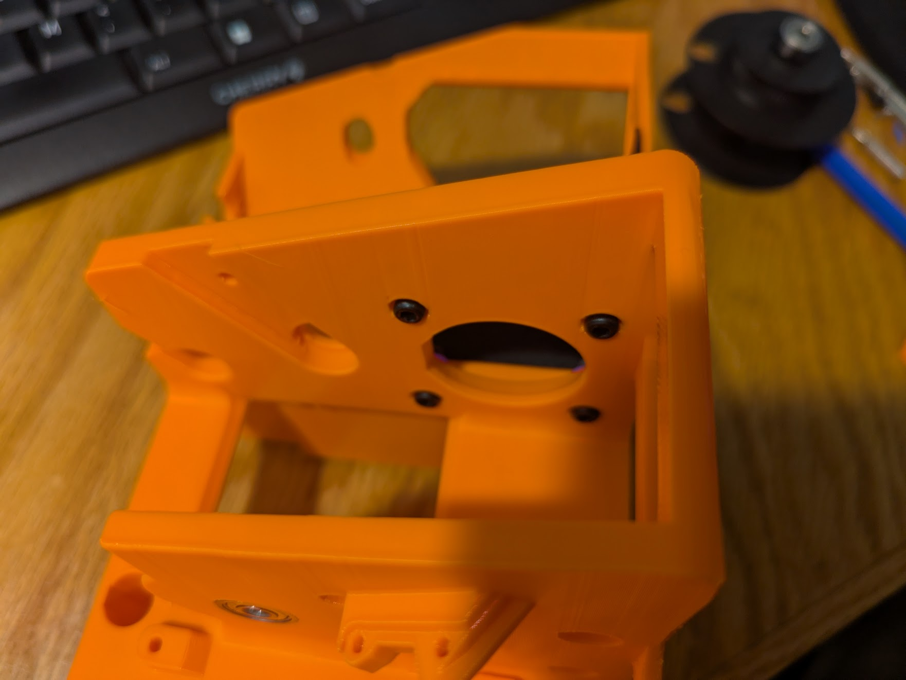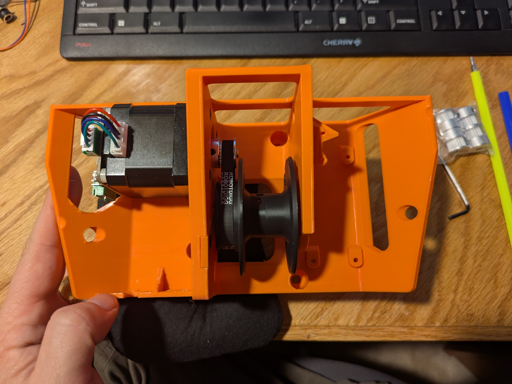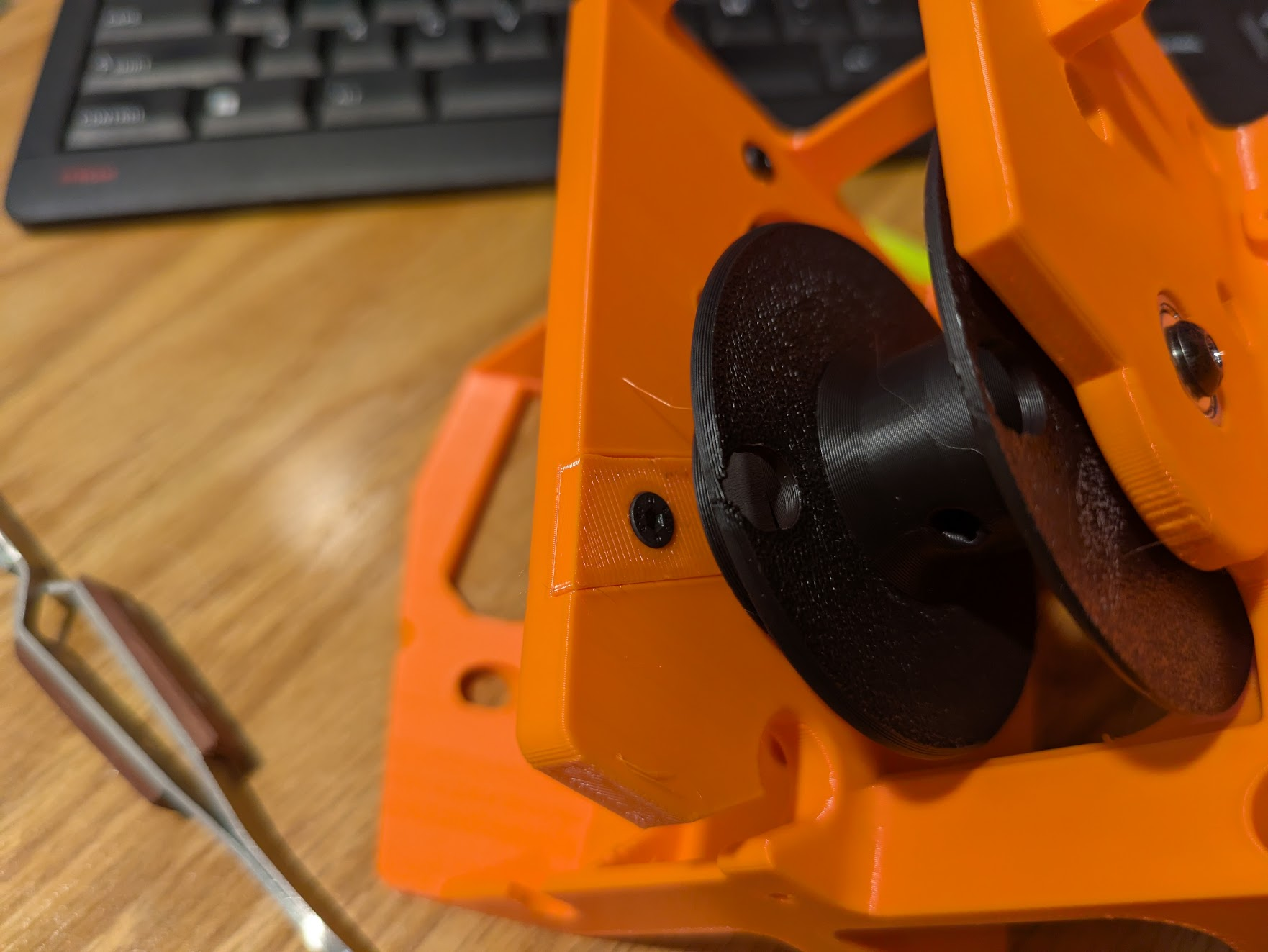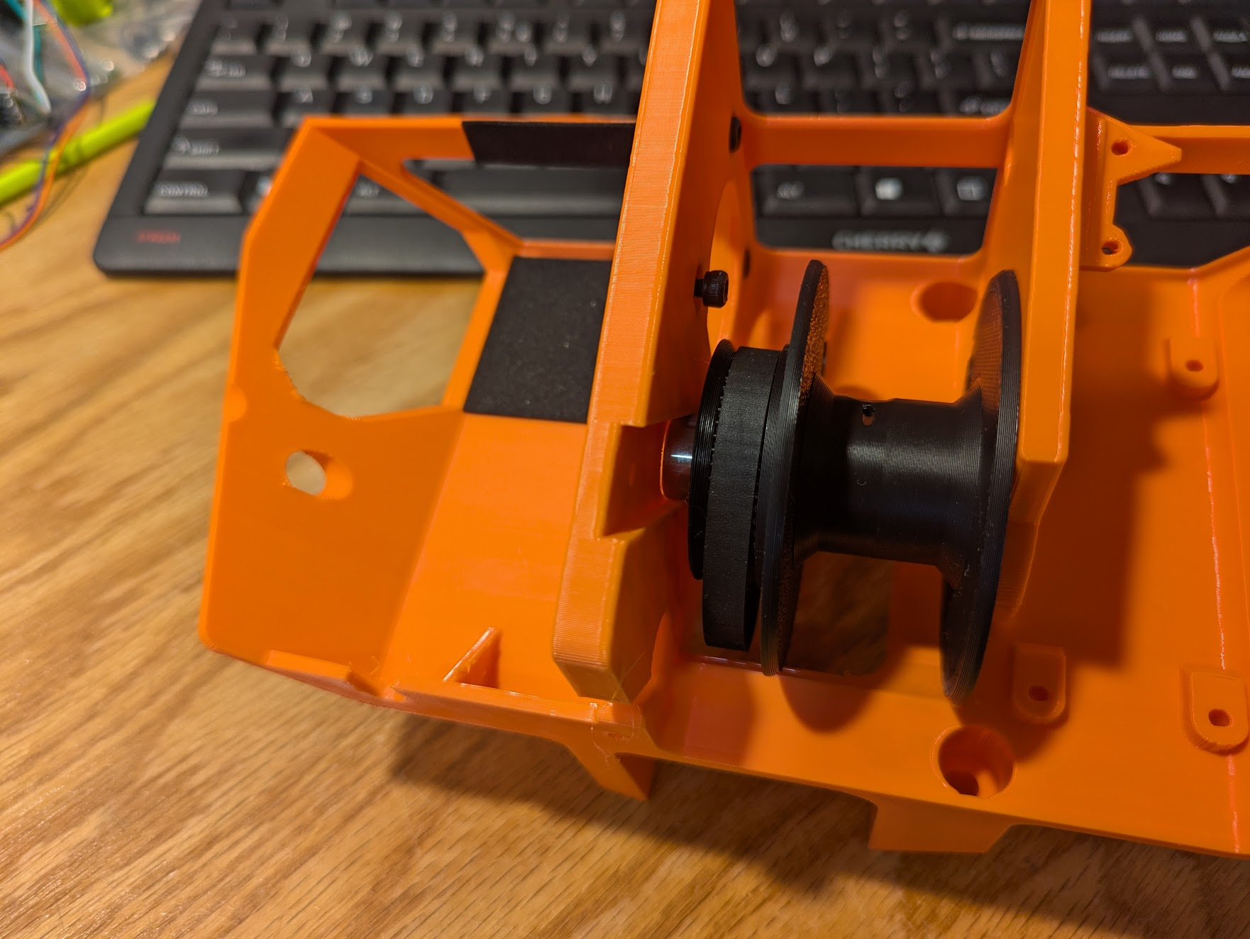 Insert an M4x12 screw into the bearing that is pressed into the frame. Place two M4 washers onto it on the inside of the rib. Now you have to get through the fiddly step of installing the spool without these two washers falling off. they are important. without that spacing, the spool can touch the frame, and that makes noise. you will need to pull the screw back as pictured.