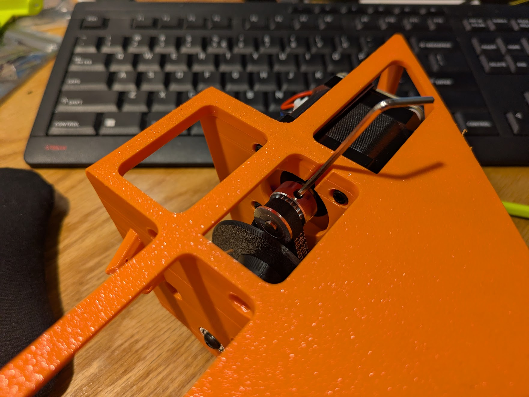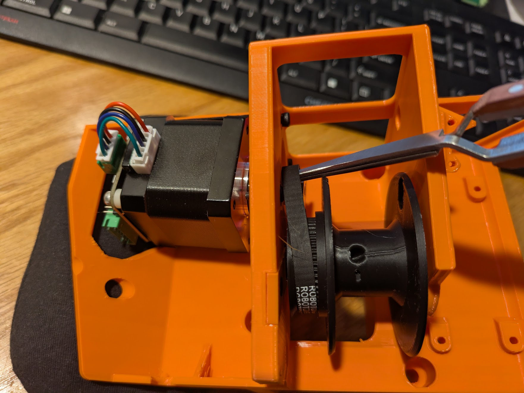 Work the belt over the pully wheel with a tool and install the motor with the larger connector facing downwards. (down is the narrower end of the frame.) Tighten the screws by using the printed screwdriver and the holes in the frame and spool to access the screws.