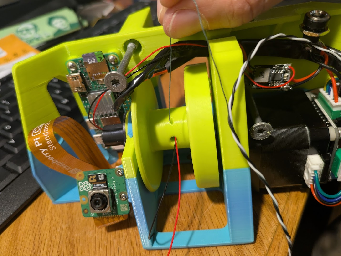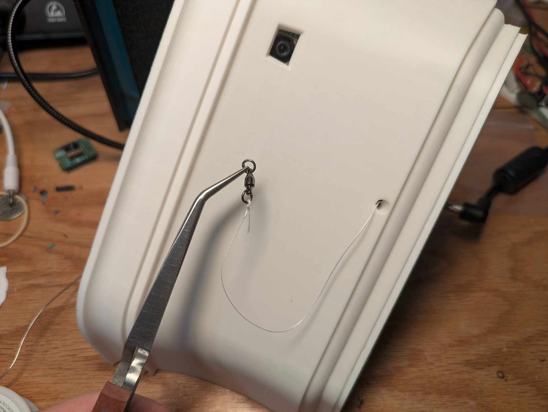 Power is supplied to the gripper via a wire that takes the place of the fishing line, and is transferred via a slip ring at each end.