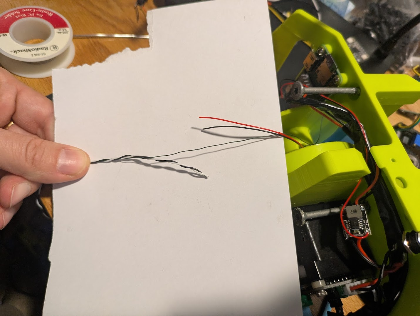 Trim back the black and white wires of the powerline so that they end where the wires of the slip ring end, with just a little slack. The Fishing line must take any tension in the event that the spool becomes completely unwound, so it must be tied off to the spool with a shorter length than the power lines.