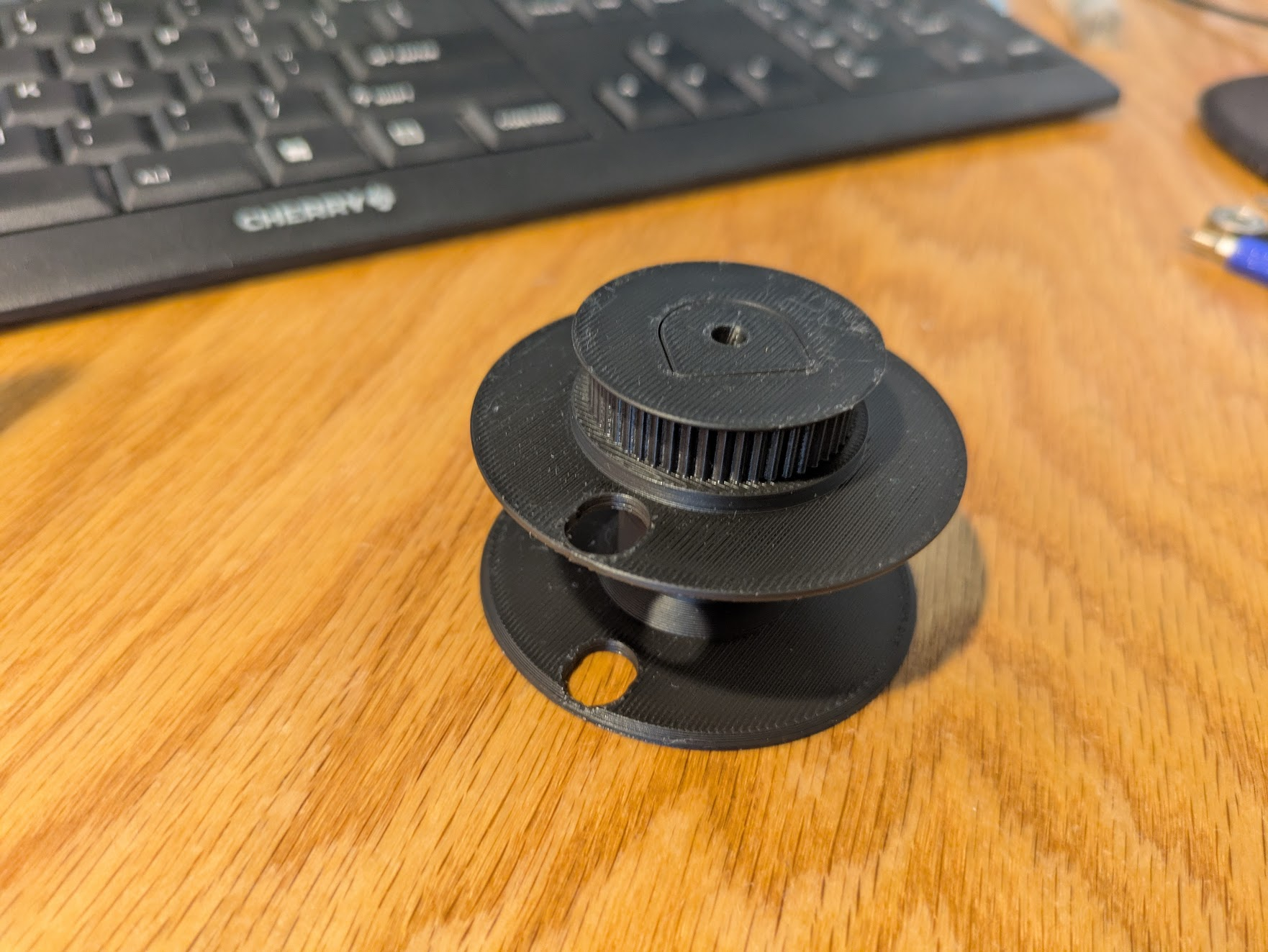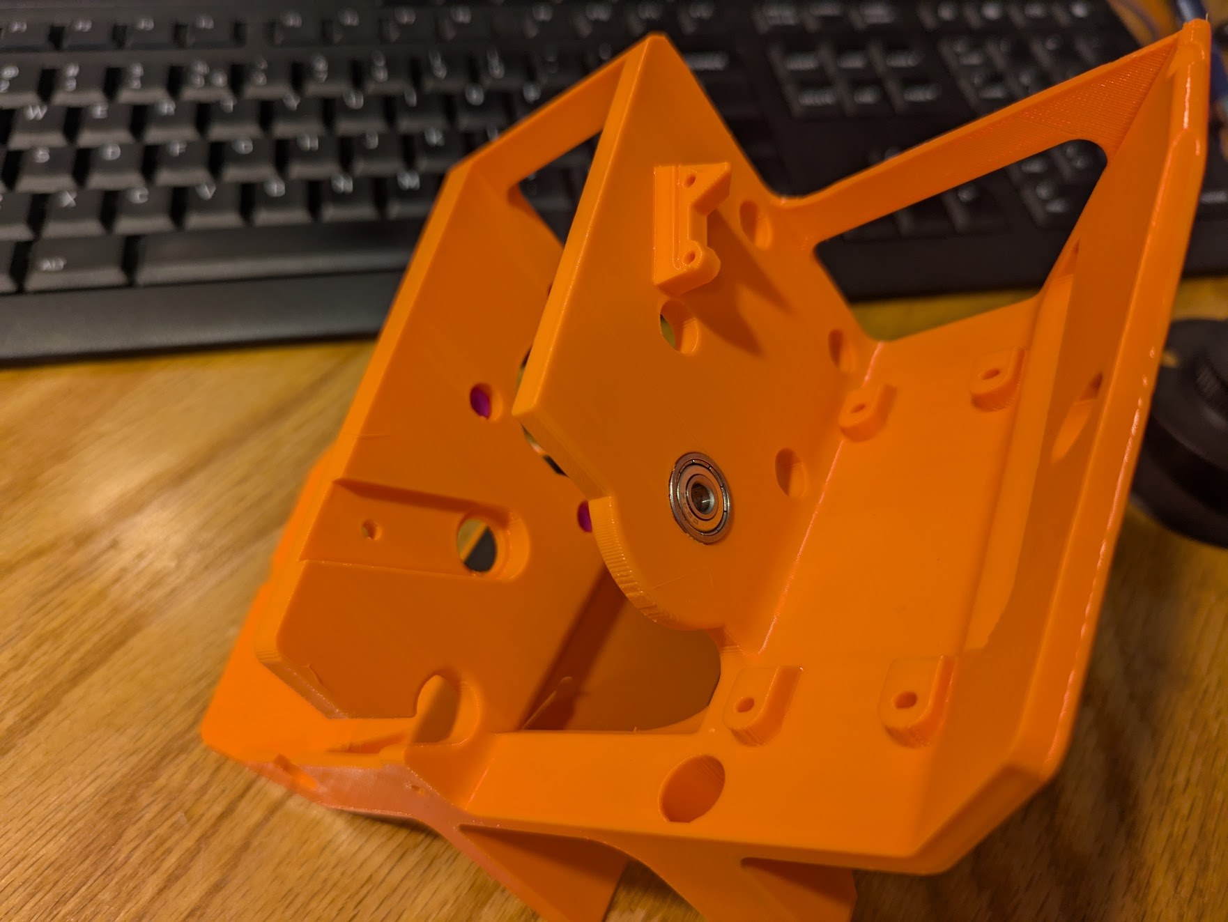 Press a bearing into the pictured hole in the narrow rib. Make it flush with both sides.