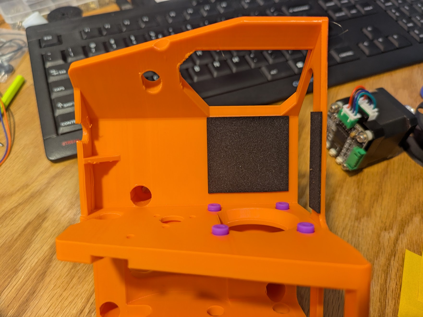 Cut out a square piece of adhesive foam grip tape and an 8mm wide strip of tape and stick them in the pictured locations. These serve to prevent the motor from making rigid contact with the frame. If it makes rigid contact the robot gets loud because the frame and wall act like a speaker.