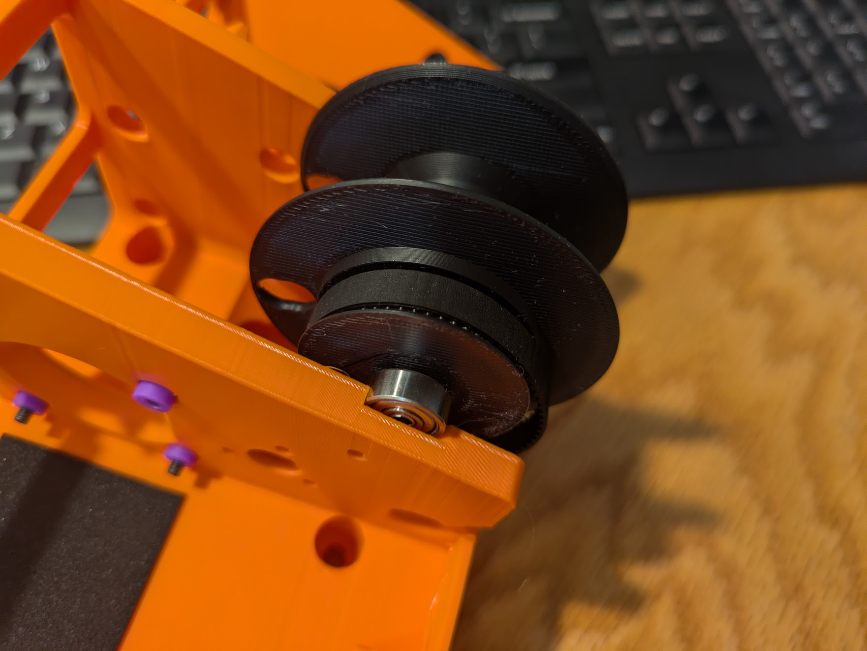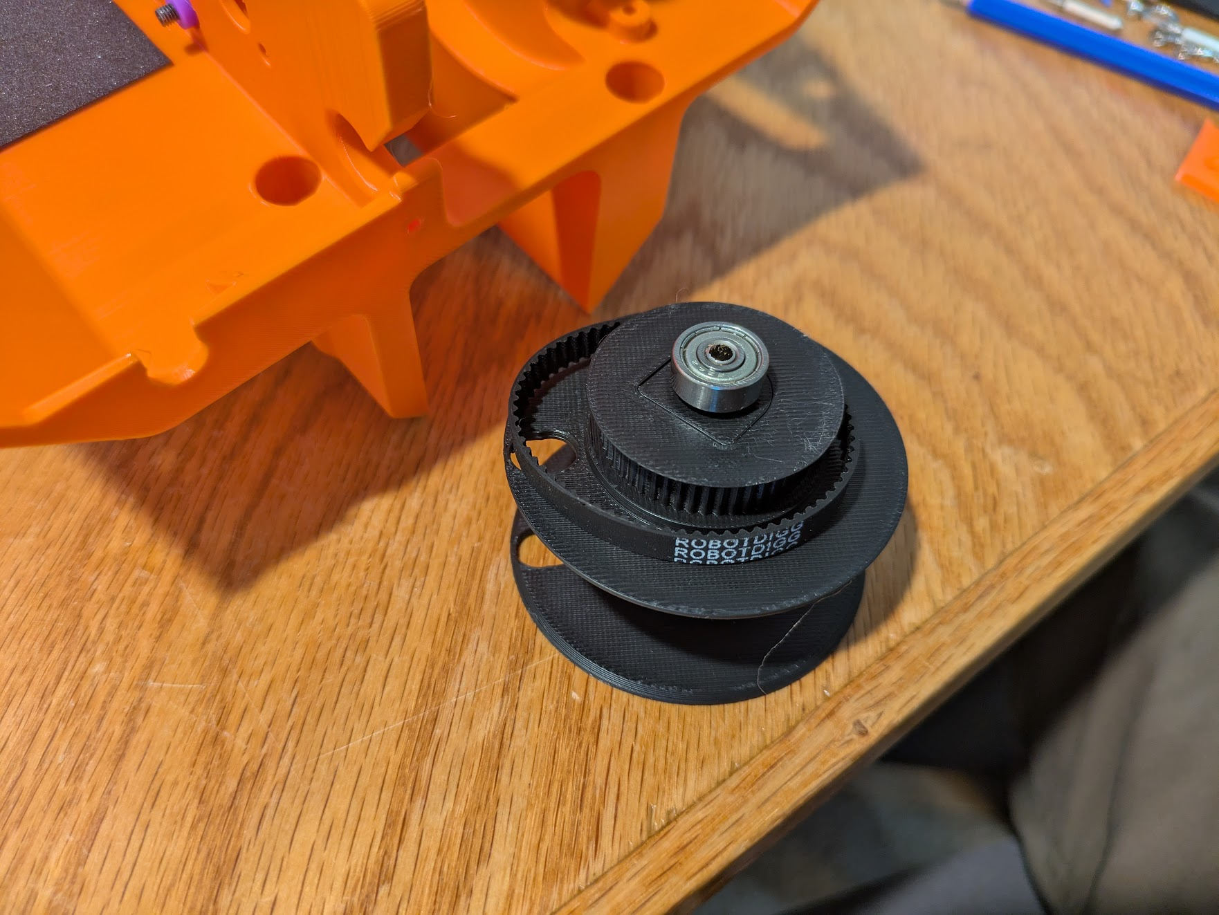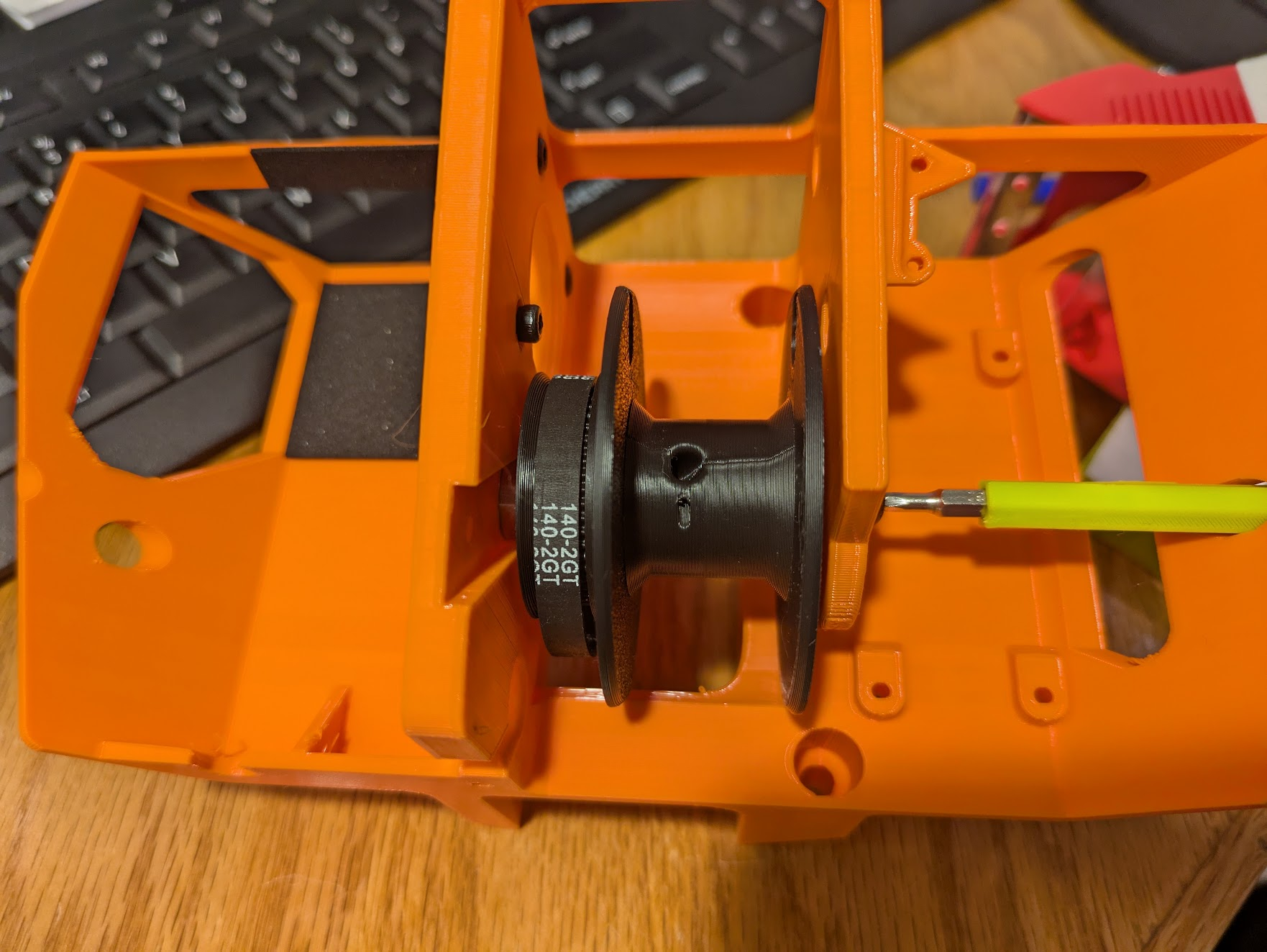 Place the belt onto the spoo, then slide the spool into place on the frame. The spool’s grooves side faces the thick rib. Slide the bearing down the slot, while pressing the M4x12 screw on the other side in so the washers don't fall off. when the bearing is fully seated and the spool is straight, the M4 screw will fit into the hole on the flat side of the spool. Screw it in using the printed screwdriver and an appropriately size hex driver.