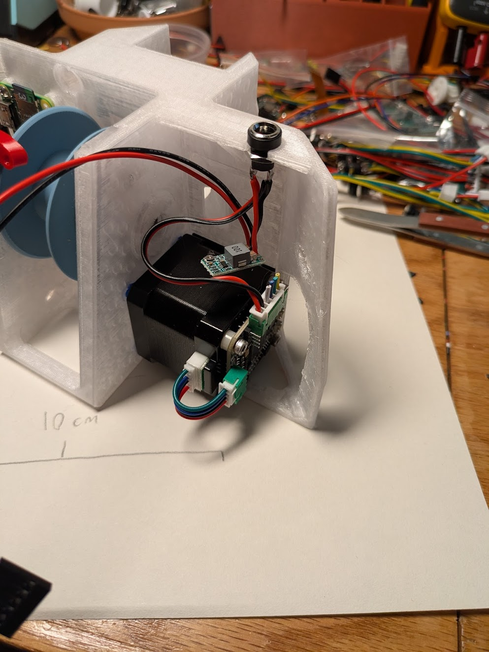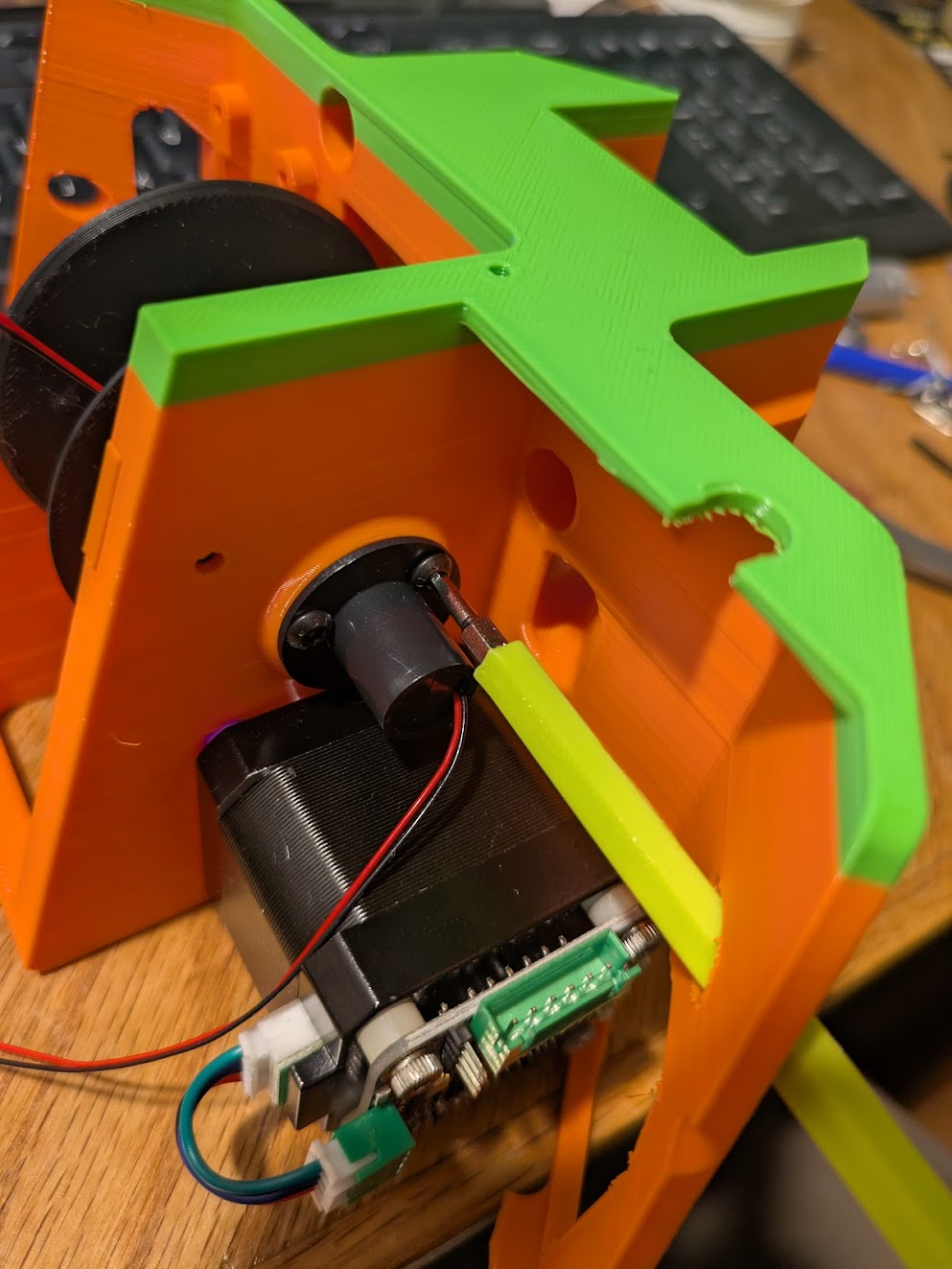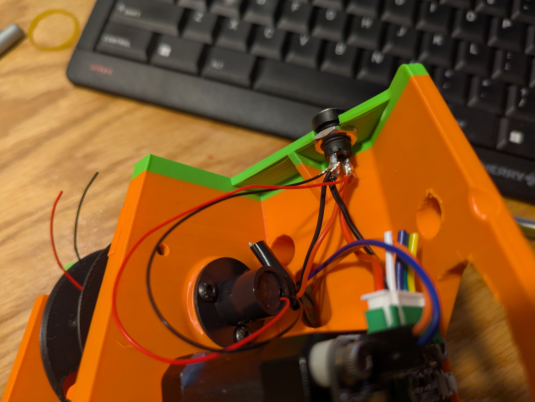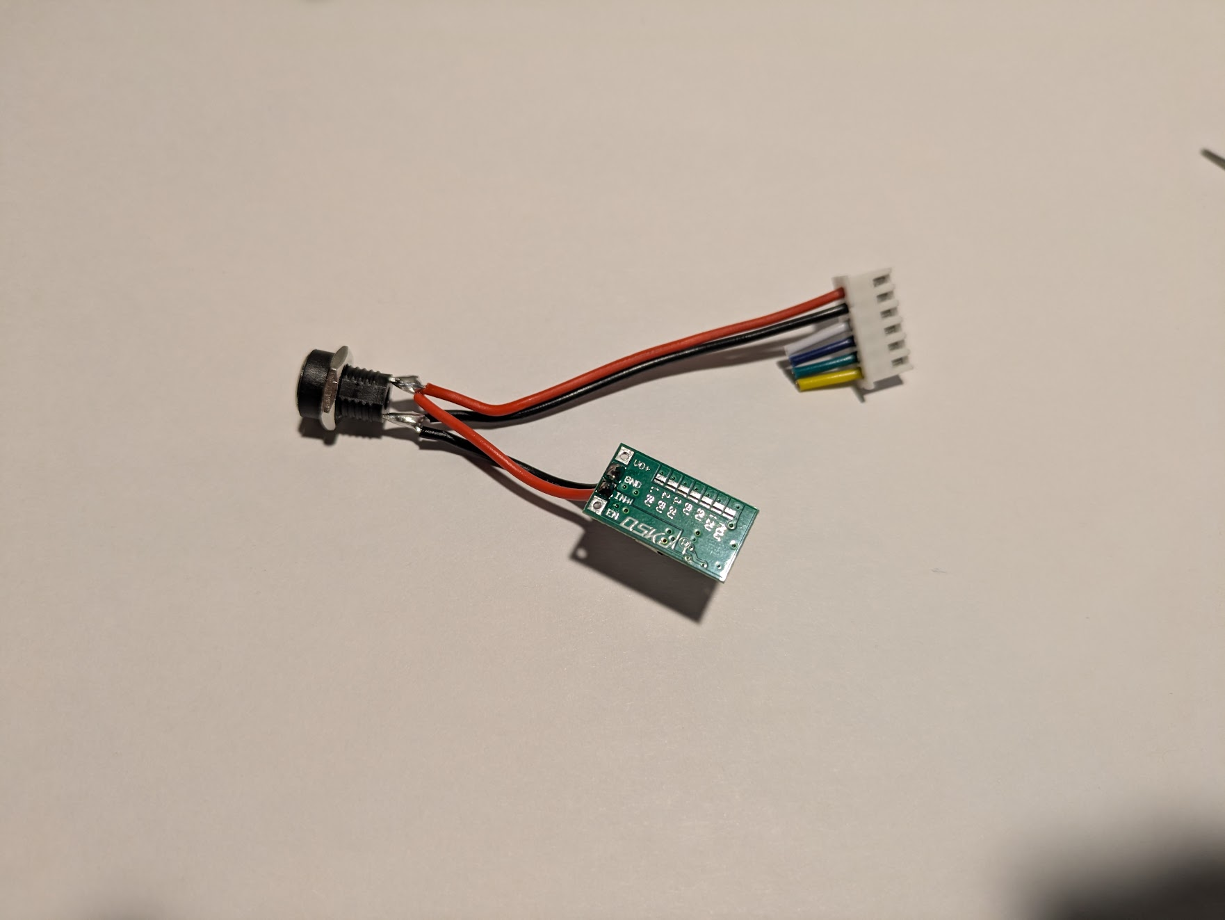 Locate the long cable that came with the MKS_SERVO42C. It has two different ends that are mirrors of each other. You can use either end to make a cable that matches this photo, VIN and GND will be red and black on one end, or yellow and green on the other end. Note the orientation of the white connector in the photo. Cut the power and ground wires to 7 cm, and all others to basically zero. Solder the black and red leads (or green and yellow) to the barrel jack. (it’s long leg is ground) The motor will receive 24v from this connector.