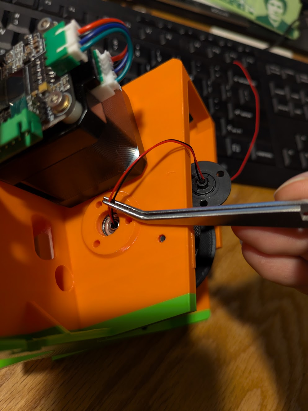 Wiggle and push the wires until they come out of the outlet in the spool’s center. Pull them the rest of the way through. Seat the slip ring in its place and secure it with three M3x4 screws.