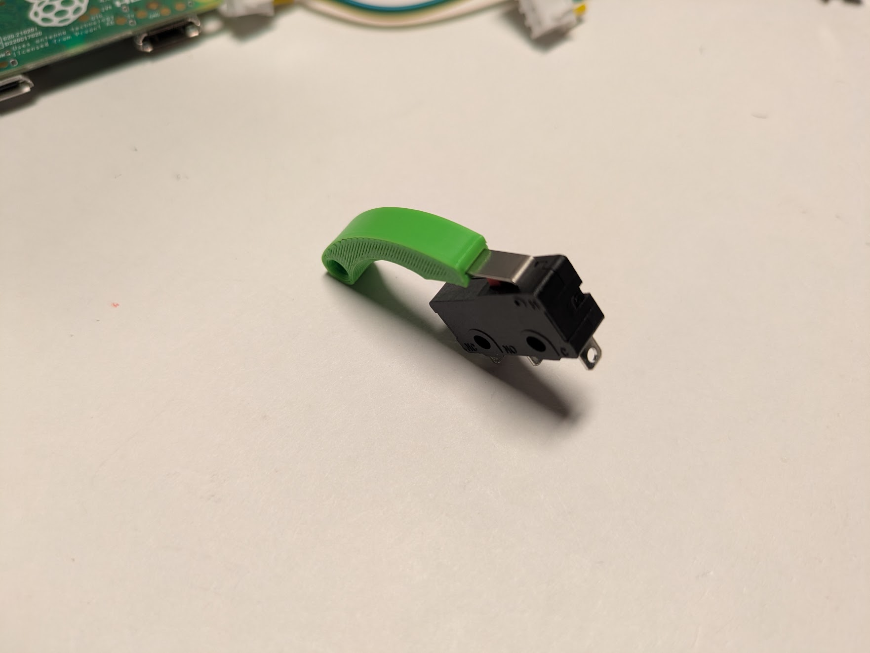 Feed the final two loose wires from the back to the front through the hole between the narrow rib and the raspberry pi. Cut them to an appropriate length, strip, and solder them to the right two contacts of the micrswitch. polarity is irrelevant.