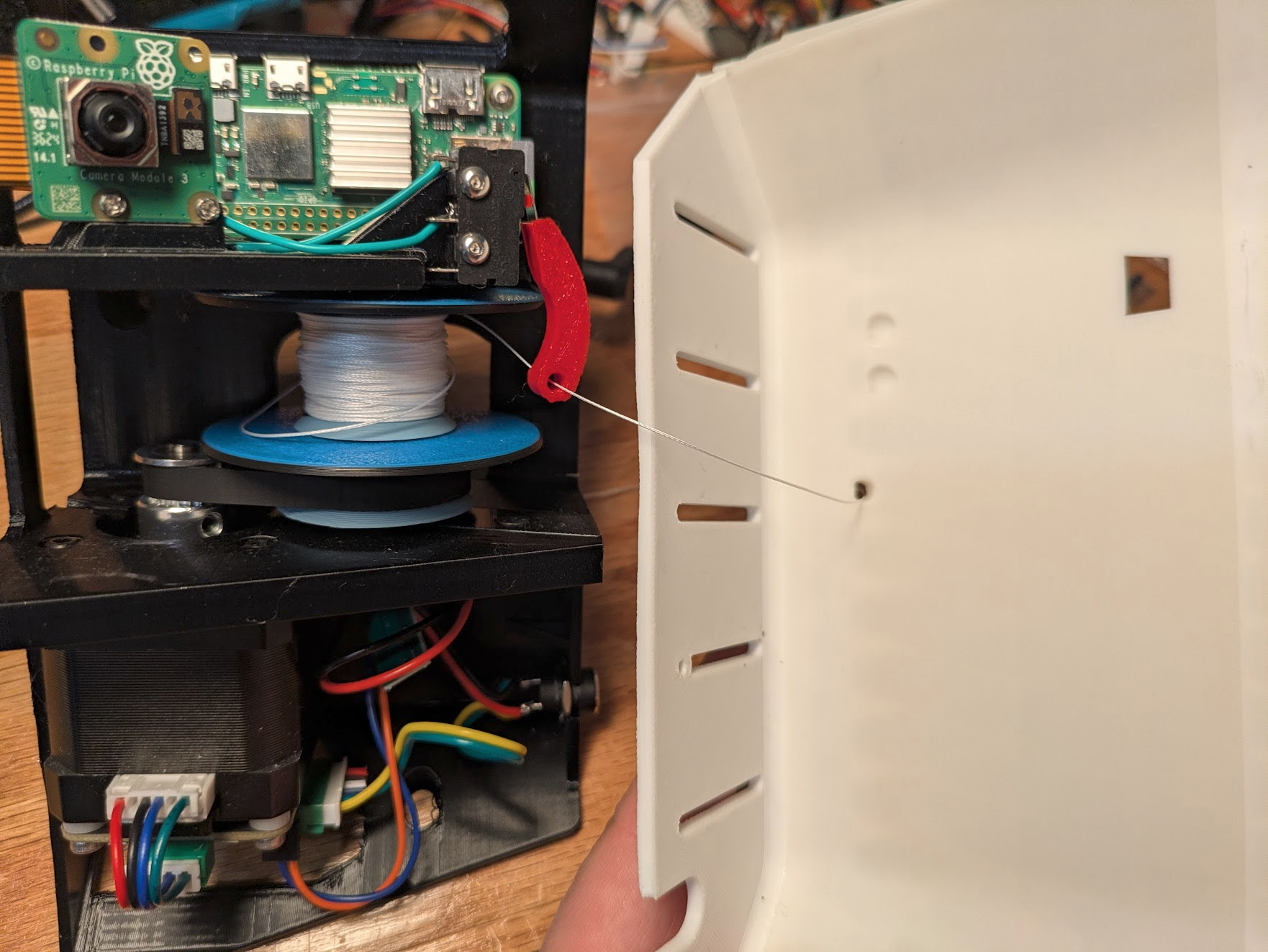 Thread it through the hole on an appropriately shaped cover peice. Click the cover piece in place, making sure the line does not become pinched anywhere. Gently pull out about 30cm of line from the hole, confirming that the microswitch clicks when transitioning from tight to loose and back again.
