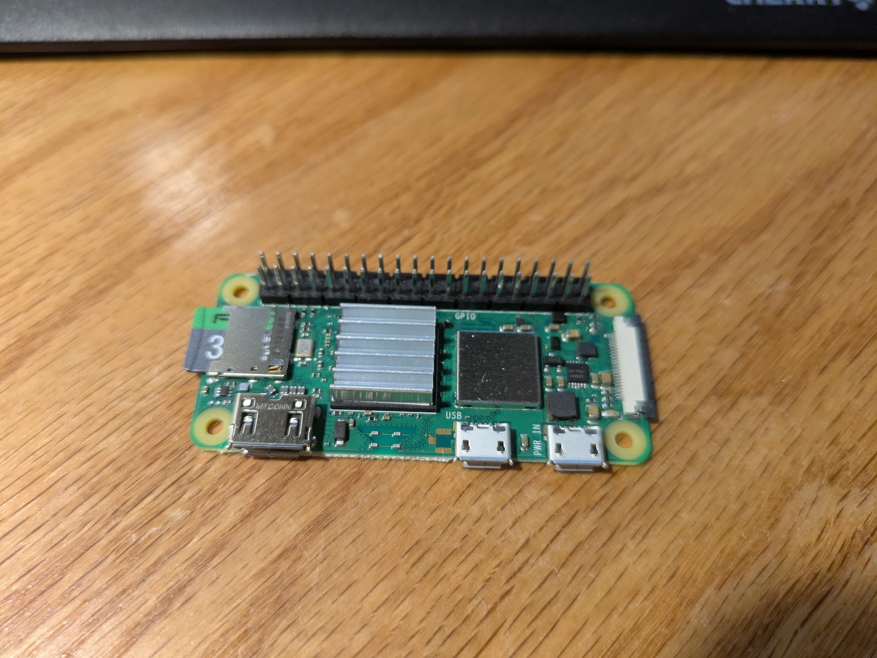Stick a heat sink onto a Raspberry Pi Zero 2W (with header). It goes on the black chip.