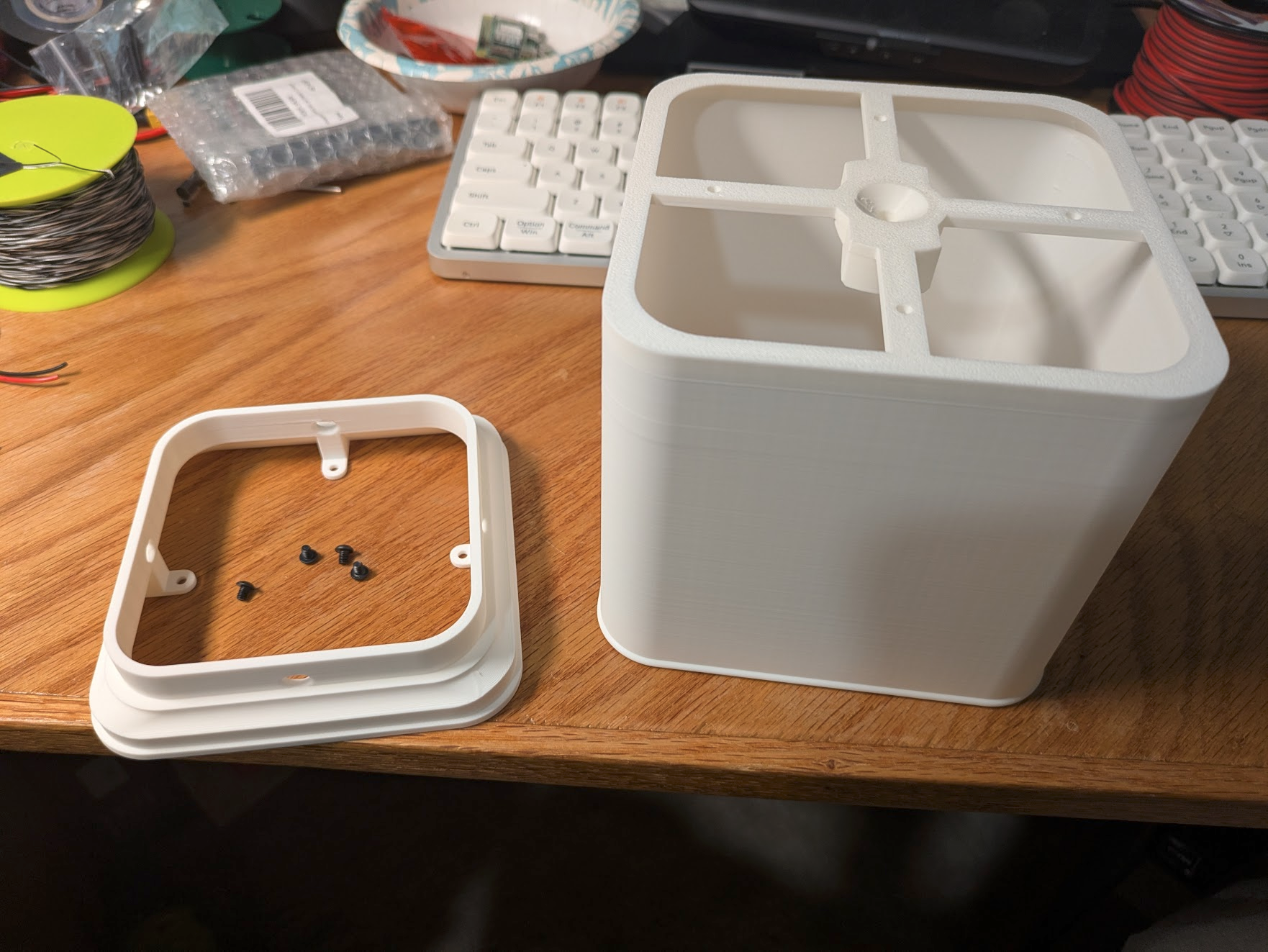 Print the components of the gantry in a white or light colored filament with two walls and 12% cubic infill. Attach them together with four M3x4 screws.
