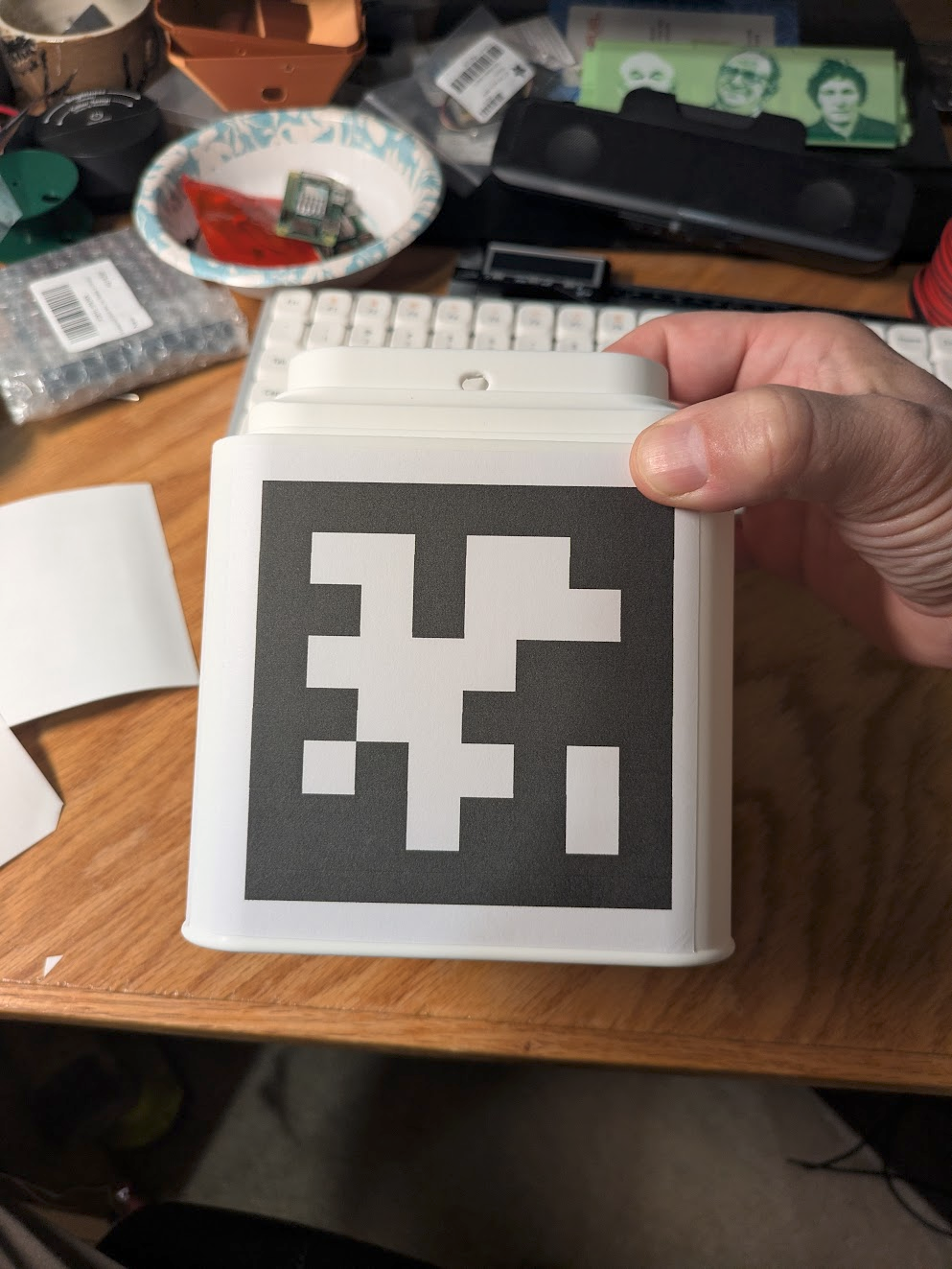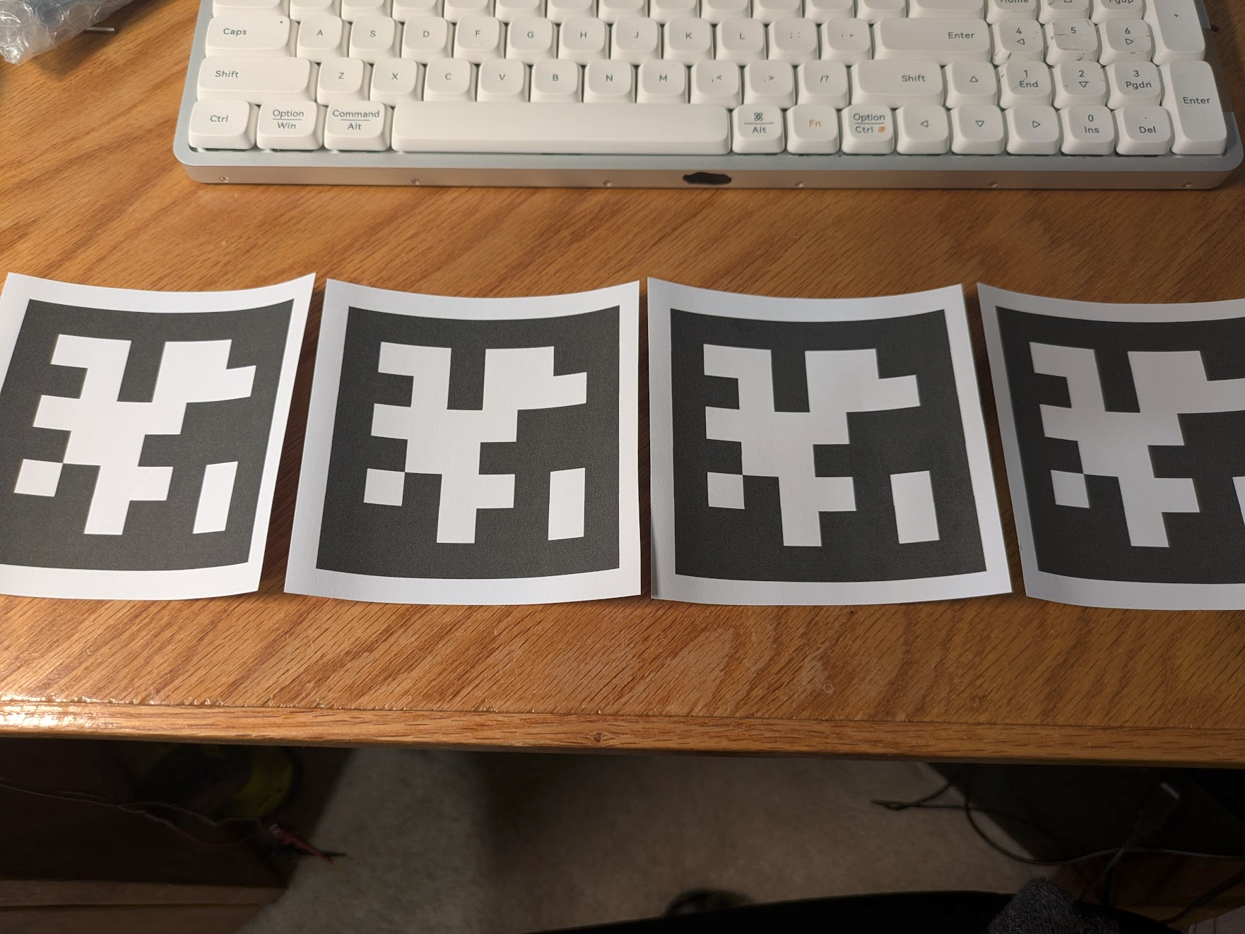 You should have received four copies of the “gantry_front” aruco marker on sticker paper. Cut out the stickers with a ruler and an exacto knife along the thin dotted line, which leaves a 1cm border around the marker. If you need to print the stickers again, You can find the document here (print 2 copies of page 2 only) and the paper on amazon