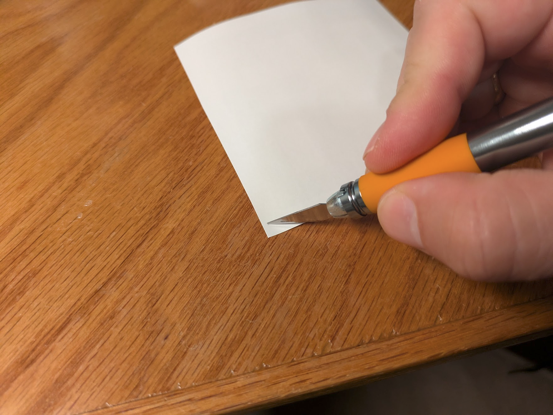 To more easily remove the backing, make a gentle cross cut into the corner of the backing with the knife with only enough pressure to cut the backing, but not the sticker. Put one sticker on each face of the gantry. They must be oriented correctly. The word “gantry_front” is printed at the bottom of each. Note that the top of the gantry is the part where the second part was screwed on. Refer to this image for the correct orientation