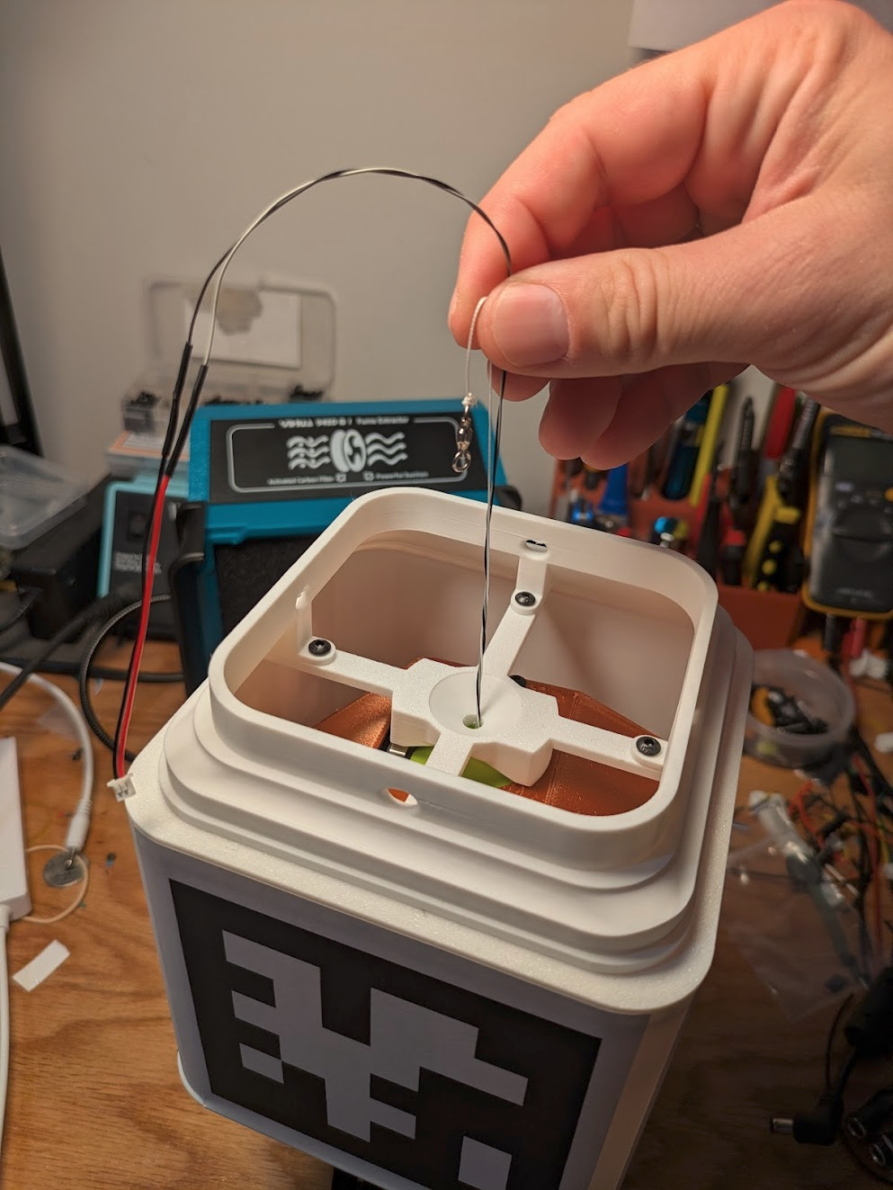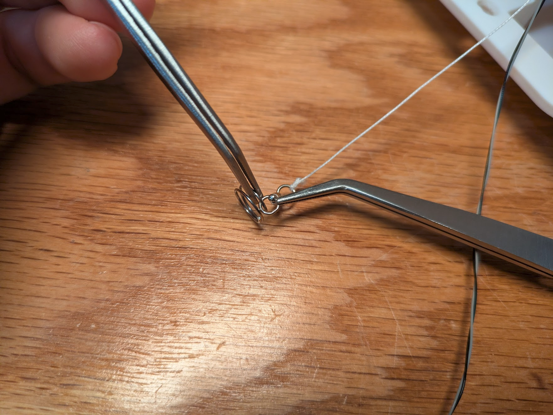 Thread the gripper's JST connector and fishing swivel up through the gantry's center hole. Attatch a 10mm keyring to the gripper's fishing swivel. this prevents it from falling back through the hole. This is yet another one of those situations where it's better to have cross locking tweezers for hands.