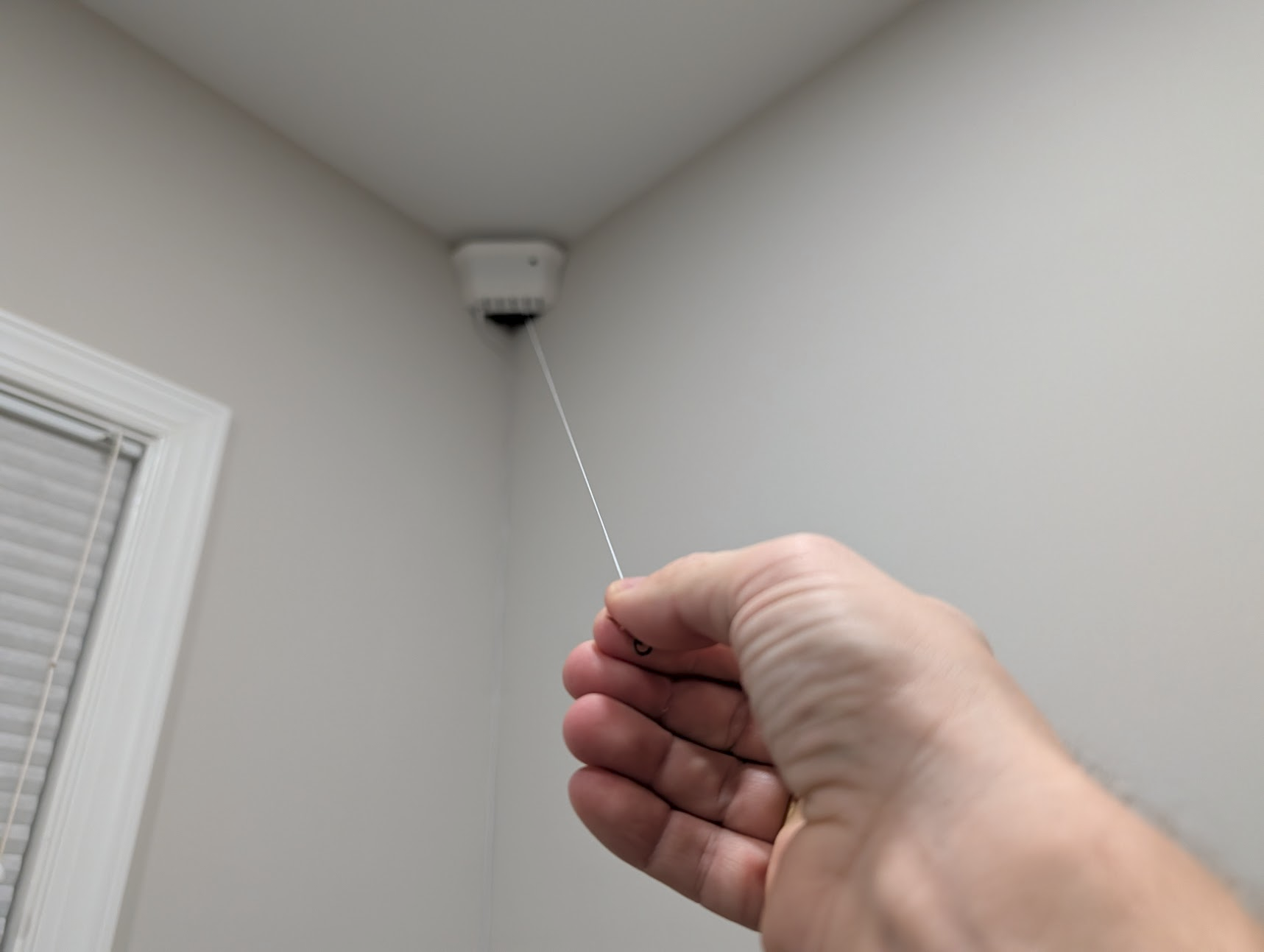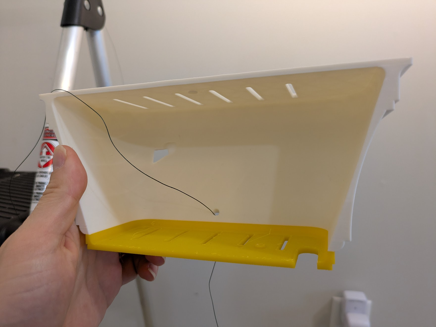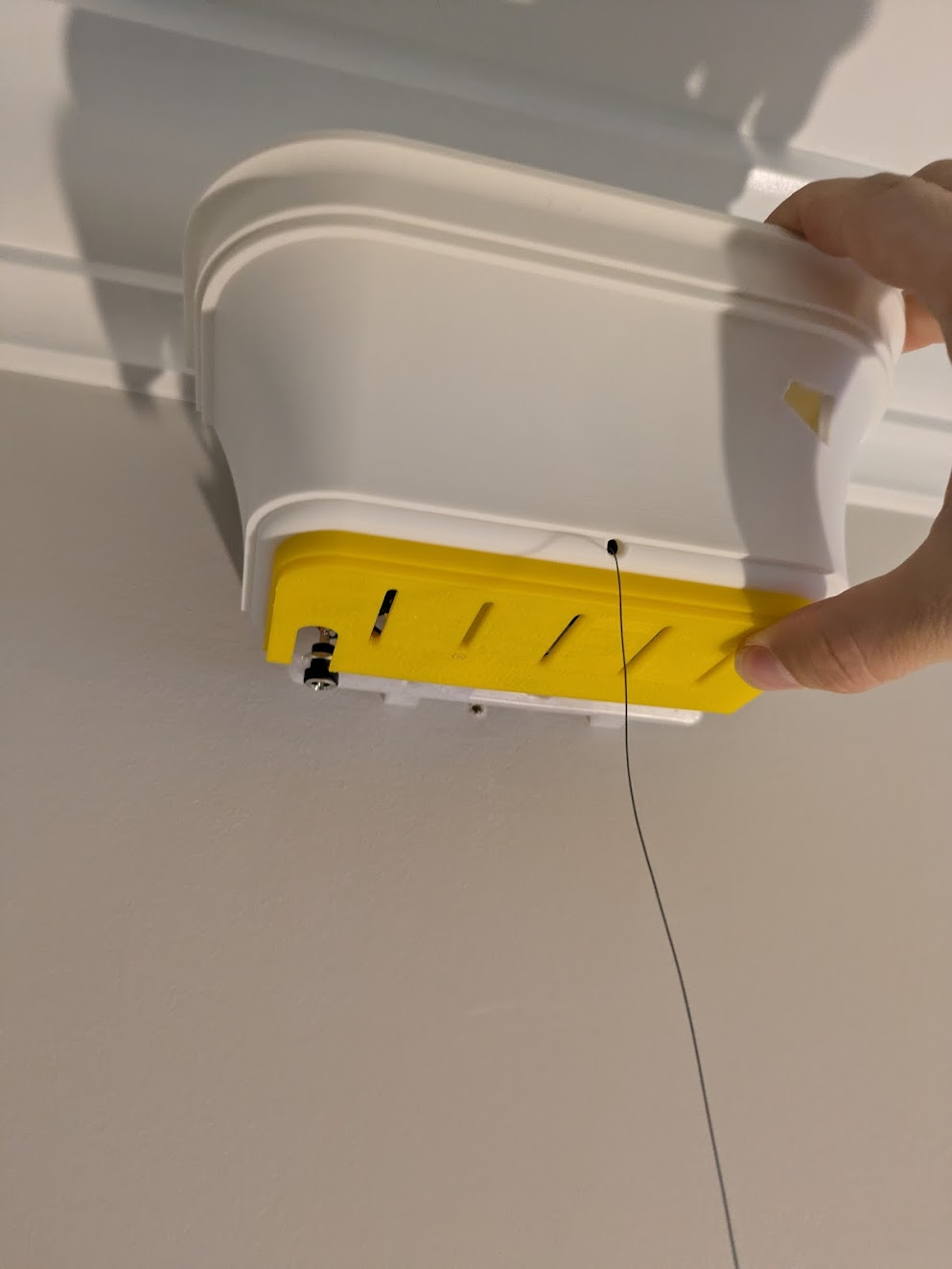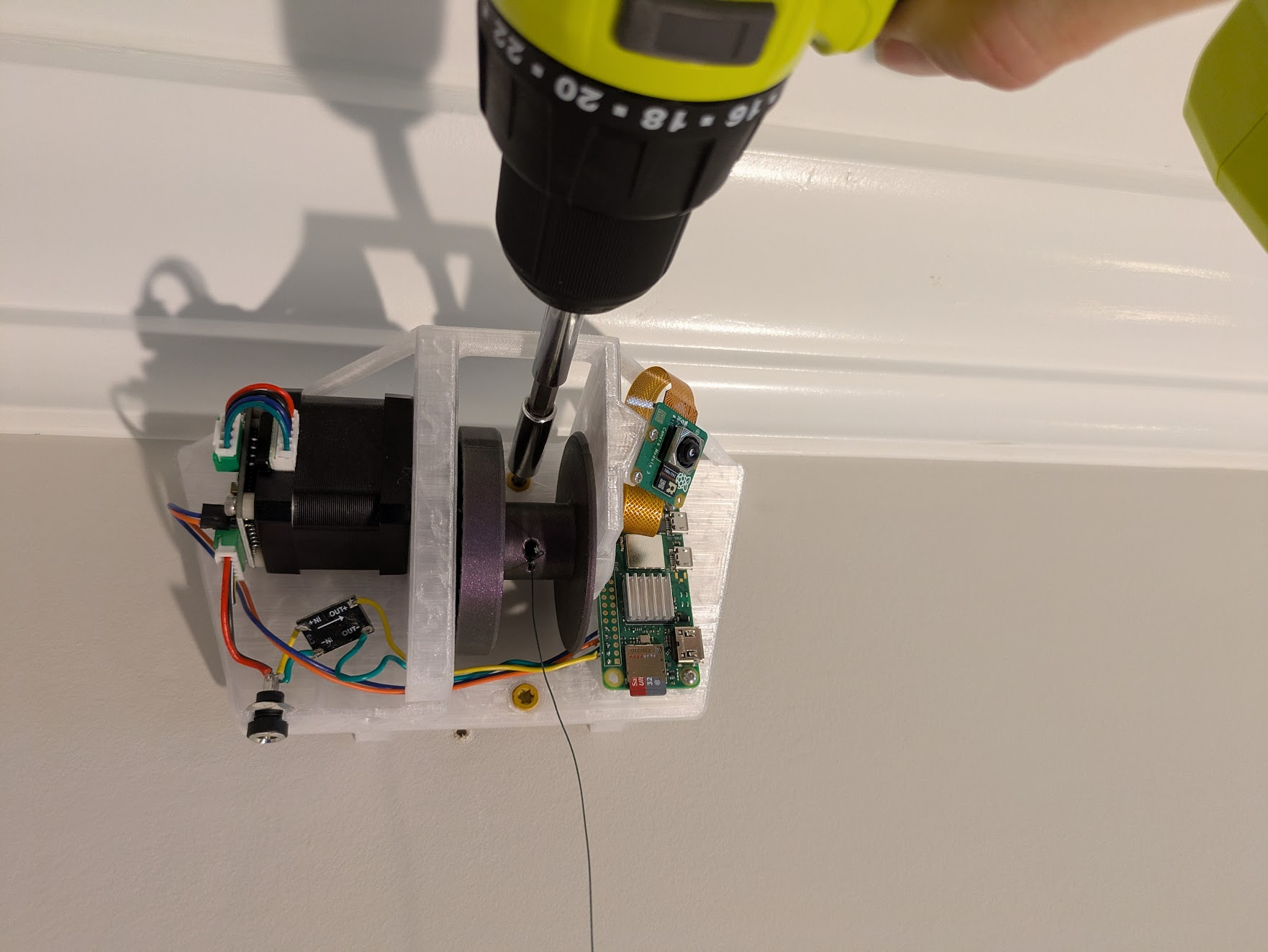 For the power line, thread both fishing line and power through the hole.