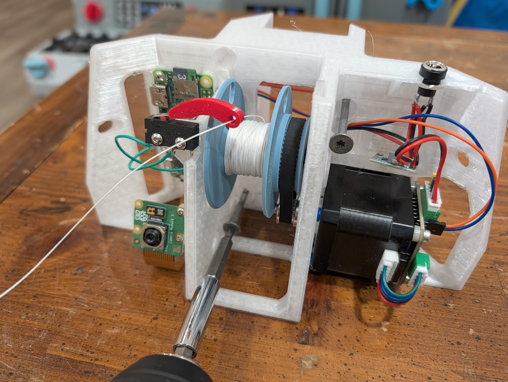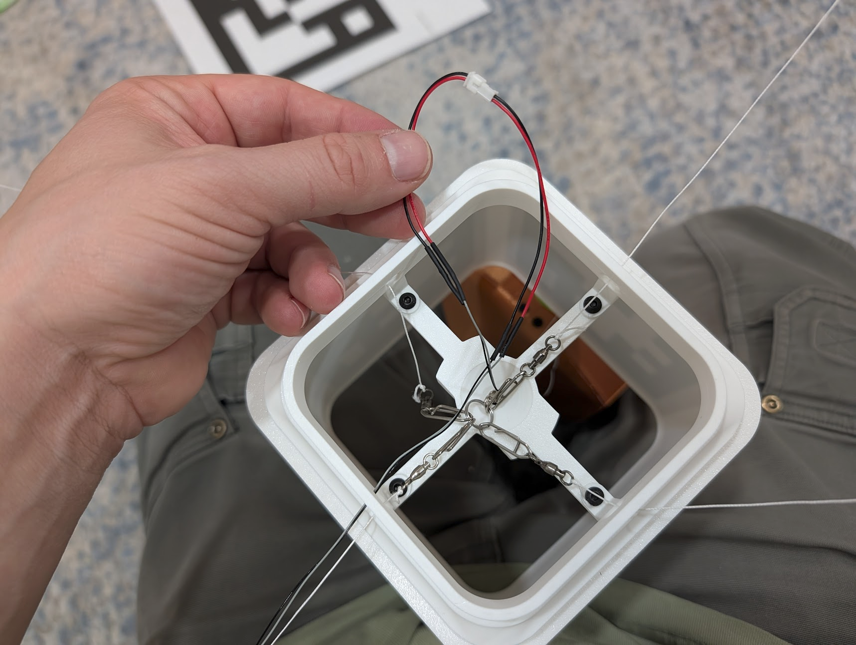 When you get to the power line, pass the JST connector through the hole as well. Attach the swivel to the corresponding clip, and plug the gripper's JST connector into the socket on the end of the power line. the conductors are longer than the fishing line, making them slack so the fishing line should bear all the weight. If for some reason the conductor is bearing any weight, retie the power line's swivel back 10 cm.
