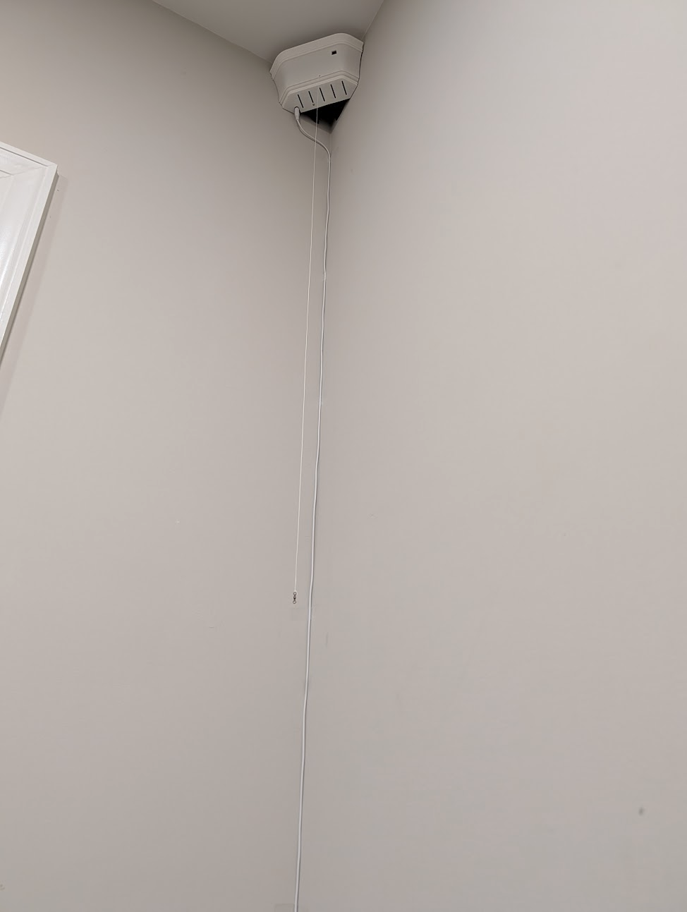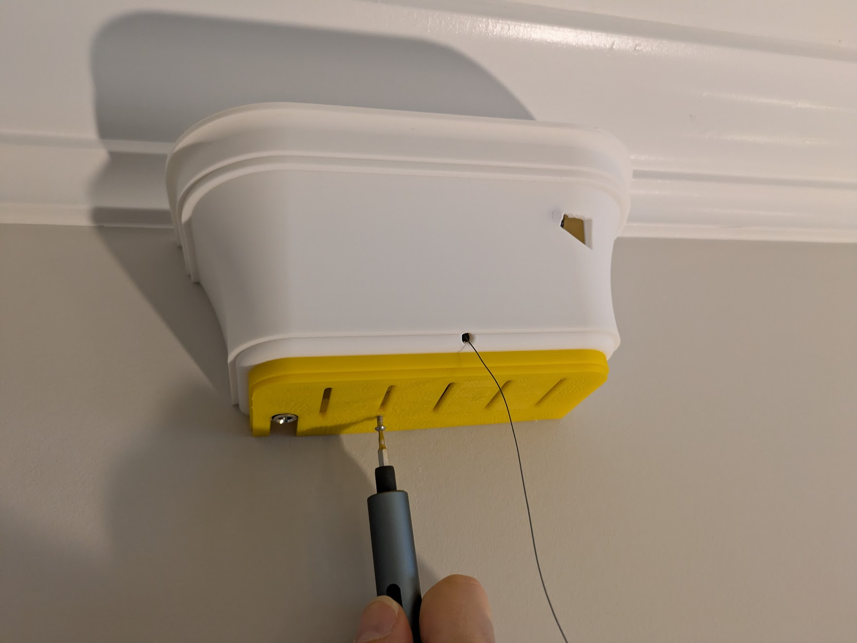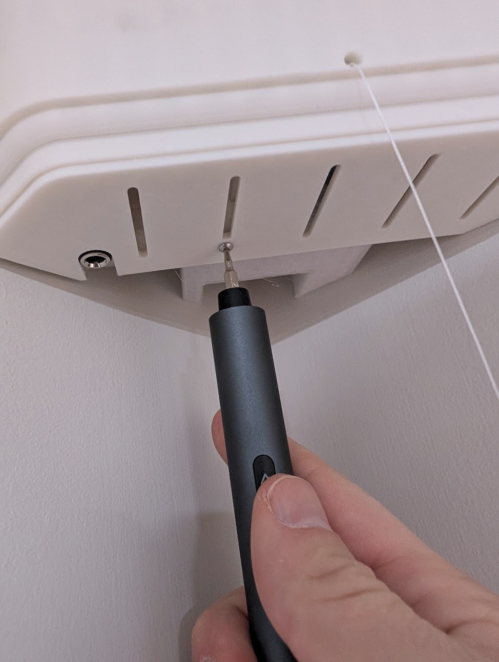 Hold the anchor securely in the corner with about 2cm of clearance to the ceiling, or to the moulding. Don't push it right up against the moulding as you need space above the top for the cover. Drive in every screw.