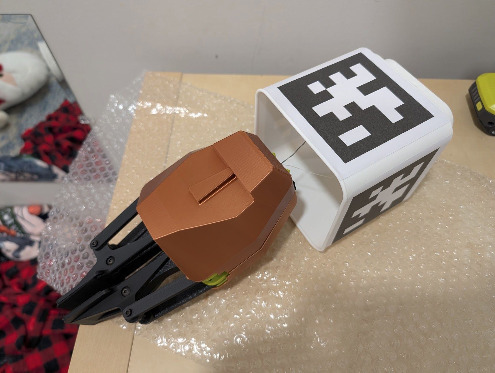 Unpack the gripper and gantry, which are attached, and place them somewhere near the anchor with the power line. pull the line out enough to reach and temporarily plug in the gripper for the connection test step.