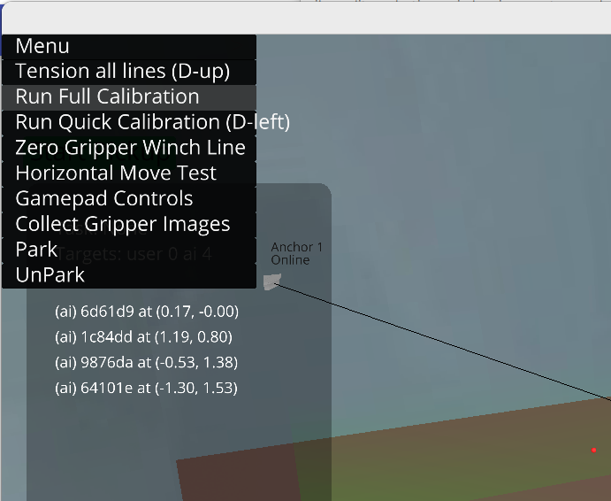 Power on all the anchors using the "all on" button on your outlet remote. the gripper's fingers may suddenly move to the neutral position, this is normal. Open the control panel. Wait for all components to be discovered, connected, and for video to come online. Select "Auto tension" from the main menu.