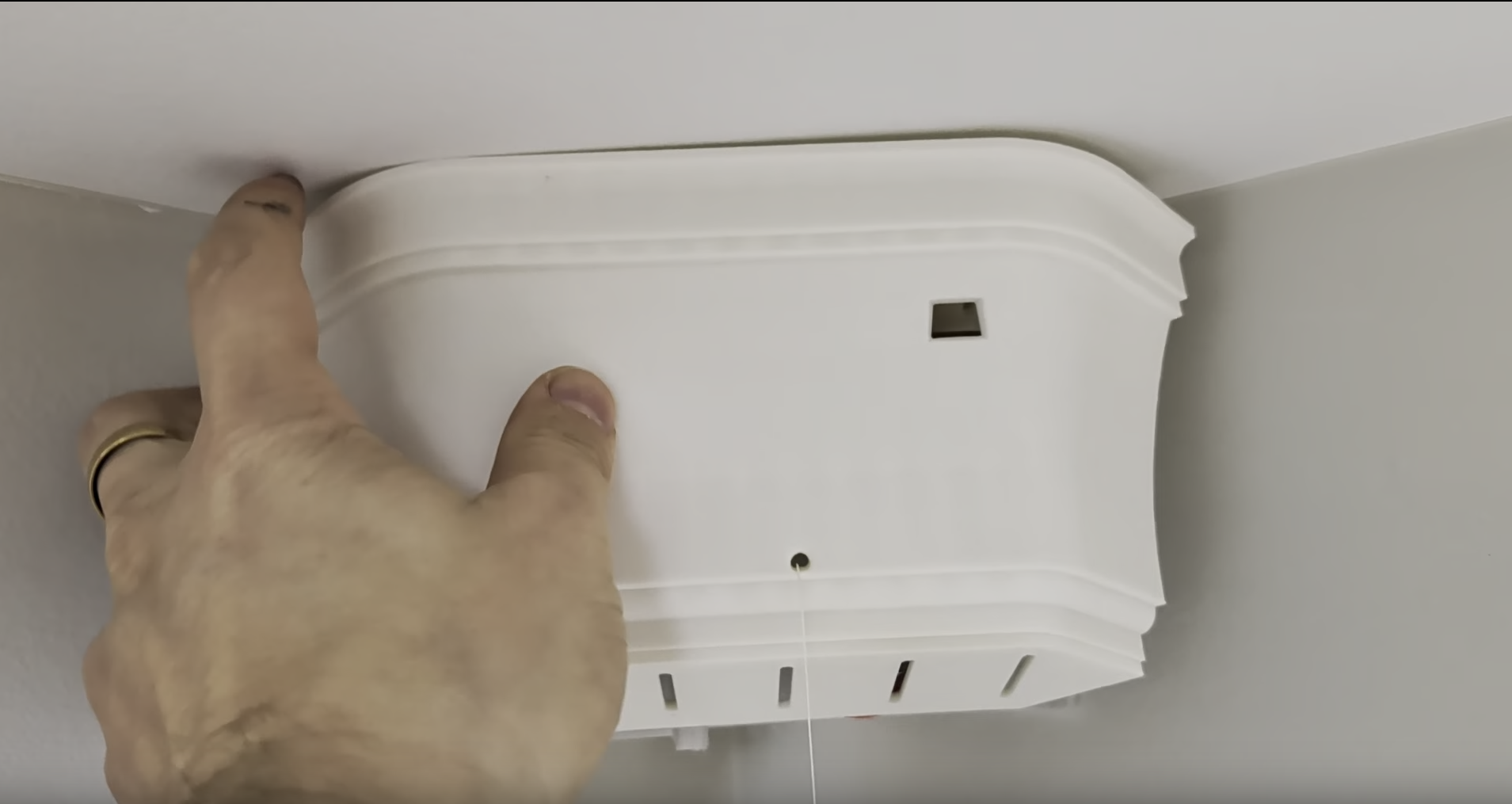 Hold the anchor securely onto the wall with the screw holes aligned to the stud and about 2cm of clearance to the ceiling, or to the moulding. Don't push it right up against the moulding as you need space for the cover. Drive in every screw.